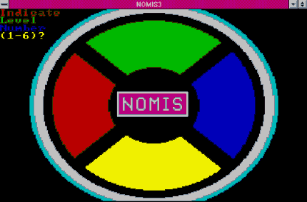 Nomis is similar to the electronic game Simon. The four colors light up in random patterns, and you must repeat the pattern by pressing the correct arrow keys. Levels 1 thru 5 are all challenging, although Level 6 should only be attempted by the autistic unemployed.